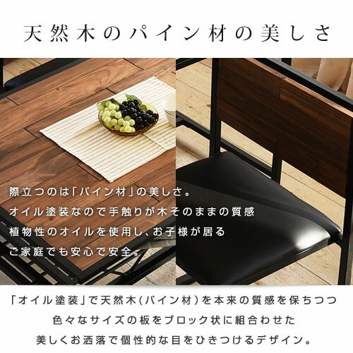 天然木(パイン)の板を個性的なブロック状に組み合わせて作る事で、デザイン性を極限まで高め、ブラックスチールとのカラーコントラストがデザインを引き締める究極の仕上がりです。