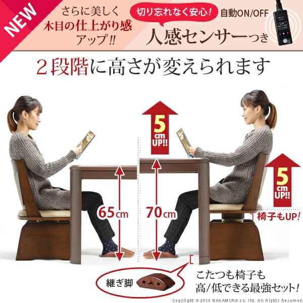 こたつに付属の継ぎ脚を付けることで、2段階に高さが変化します。
