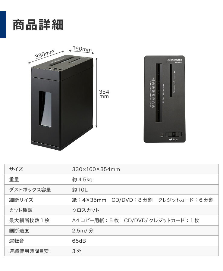 【サイズ】330×160×354mm【重量】約4.5kg【ダストボックス容量】約10L【細断サイズ】紙:4×35mm クレジットカード:6分割 CD/DVD:8分割【カット種類】クロスカット【最大細断枚数】A4コピー用紙:5枚 CD/DVD/クレジットカード:1枚【細断速度】2.5m/分【運転音】65dB【連続使用時間目安】3分【送料について】北海道、沖縄、離島は別途送料を頂きます。