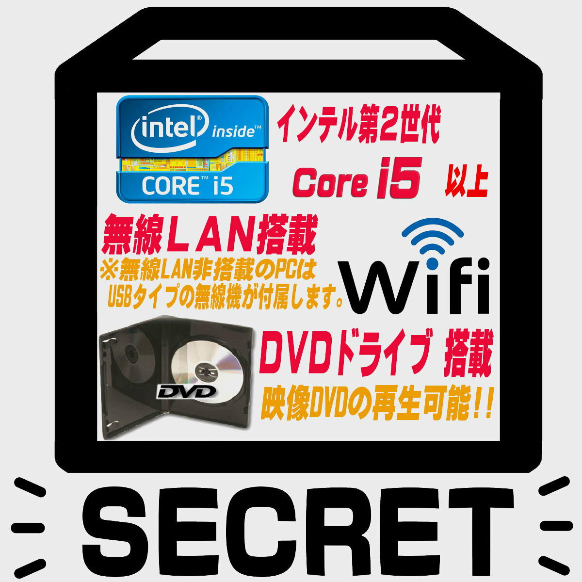 Windows10 Pro 64bit インストール済み (Win7orWin8ライセンス) CPU:第2世代 i5 以上〜 DVD-ROM DVDディスク再生可能Wi-Fi対応無線LAN 搭載、内蔵無線LANが搭載されていない場合は、無線LANアダプタが付属されます。